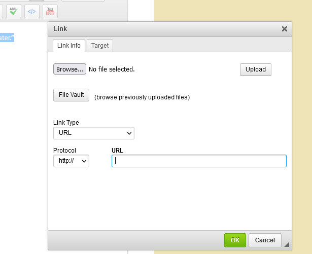 If you wish the link to open in a separate window, click on the Target tab before you press OK. From there select, New Window, blank from the drop down menu.