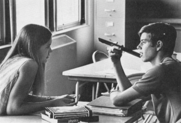 Sarah stood out in her class. Not just because of her long legs or extremely long beautiful straight hair that fell to her waist. No, she stood out because of her smile, vibrancy, and confidence. I was so pleased when the photo above was included in the front of the RHS Class of 1969 Annual. There is Sarah deeply engaged in serious and sincere conversation while I am desperately trying to get her attention by showing her how I was practicing to be a sword swallower but using my safer slide rule.